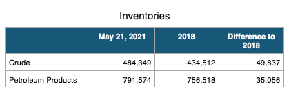 Although compared to the 5-year average, we’re fairly flat, compared to 2018, we’re about 85M barrels higher, split roughly 50M for crude and 35M for products.