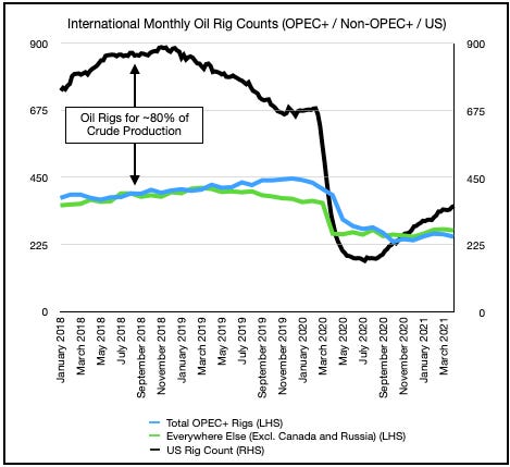 We’re simply not drilling enough, or anywhere near what we should be once we recover our full 100M bpd addiction. We can’t have rig counts (i.e., the machines and crews drilling for oil) ~30% lower for 80% of the world’s production and not have that impact us shortly, particularly as our appetite for oil returns fully. The supply/demand shortages that we’ve seen in minerals, lumber, agriculture, will now reveal themselves in energy as we recover. We’ve recovered too fast, and equally as pertinent, we’ve invested too little. As we shift from “buying things” to “doing things”, the chronic underinvestment in the energy sector will be exposed. Addicts take note, energy is about to join the commodity party, and our drug of choice is about to get a whole lot more expensive. Party on.
