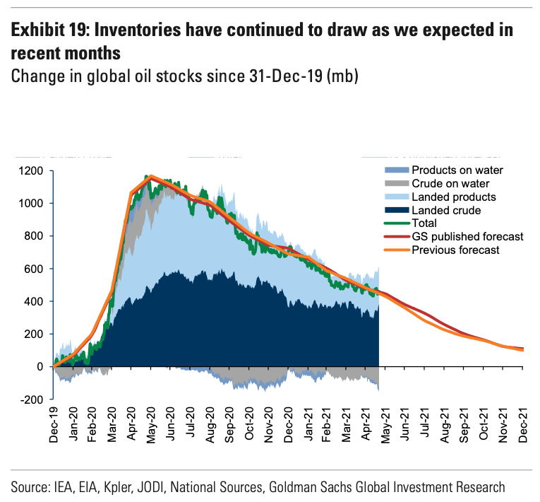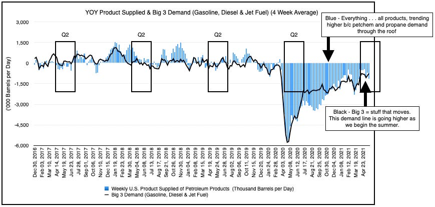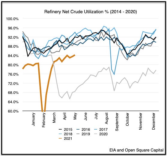 In contrast, gas/diesel/jet fuel (i.e., things that move things) have recovered much slower, but notice the uptick beginning in March. The timing’s no coincidence. On the back of our successful vaccine rollout, mobility and outdoor activities have begun to recover in the US. Note the word “begun”. We’re near 2019 levels and we haven’t even road-tripped for the summer yet. Accordingly, we can see that for both categories, product supplied are near 2019 levels, and we anticipate product demand for jet/diesel/gasoline (i.e., “things that move things”) will exceed historic levels as the pent-up demand for travel reveals itself.