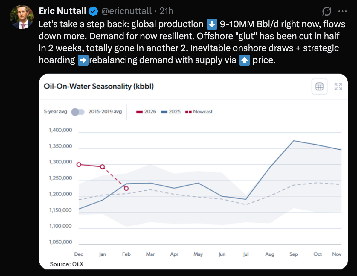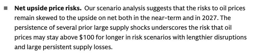 Next week, oil prices will creep higher as the shut-ins continue and supplies falter. Despite the tumult, the S&P 500 and QQQ are only down 4% year-to-date. This insouciance will allow the administration to keep wandering down its chosen path. Fair enough, but every day this continues, means another dollar added to the back of the curve when oil supplies resort themselves. We think even if the all clear sounded TODAY, we’re looking at $80/barrel oil when the fog-of-excursion lifts. If you need marines to land and force a capitulation in three weeks? Triple digits. Goldman agrees . . . higher for longer.