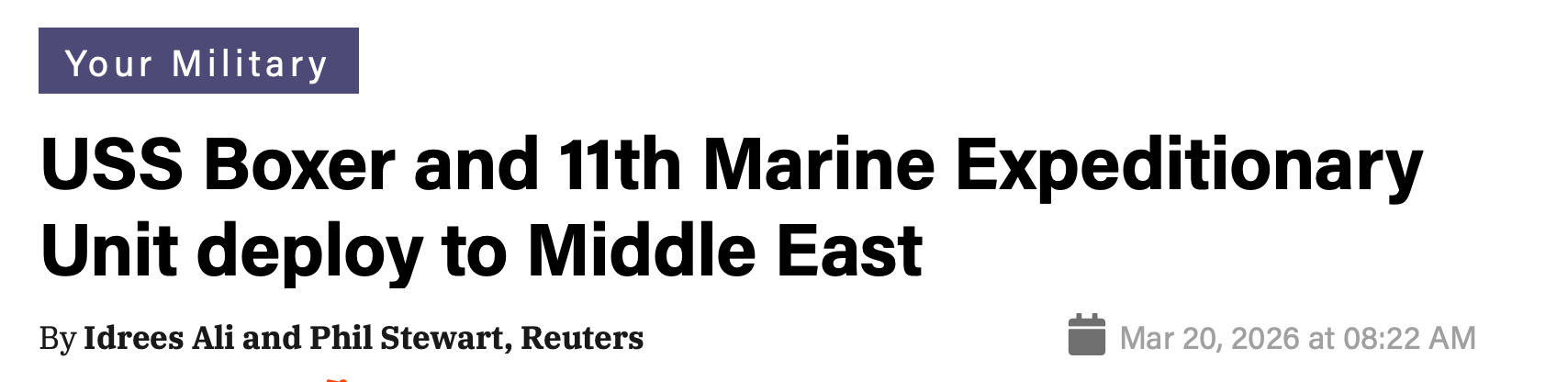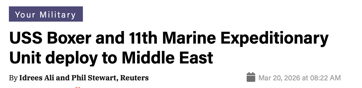 So the USS Boxer joins the USS Tripoli and its MEU in the Gulf. We won’t speculate what the MEUs will be used for (e.g., Kharg Island or the shoreline next to Strait of Hormuz), but just simply look at timing. It takes about 3 weeks for an MEU to sail from the West Coast to the Gulf. USS Tripoli will arrive before that (sometime next week), but even if it’s successful in gaining a tactical victory and taking a strategic foothold, would that compel the Iranian’s to lay down and accept a full ceasefire and peace accord? Doubtful, which means this excursion likely drags on for another 3-4 weeks.