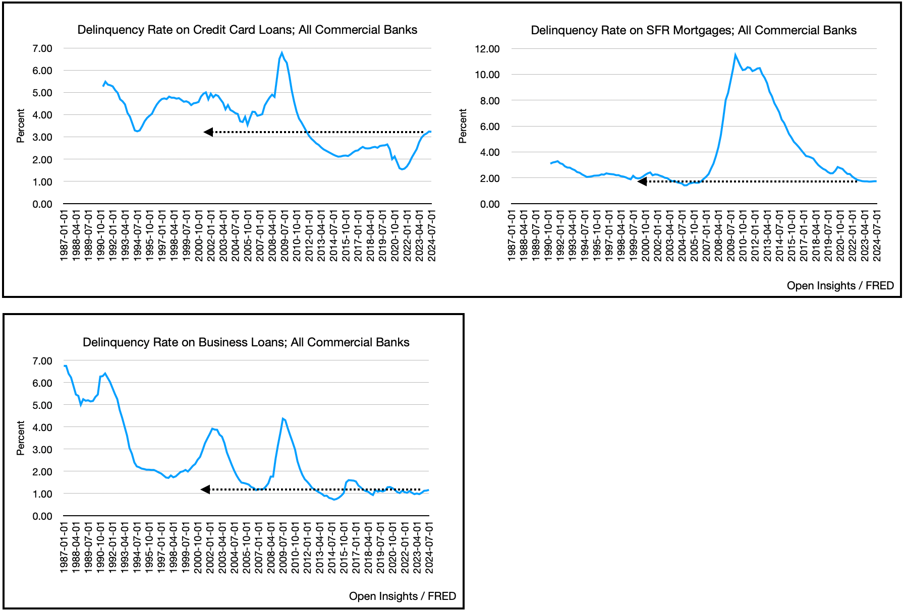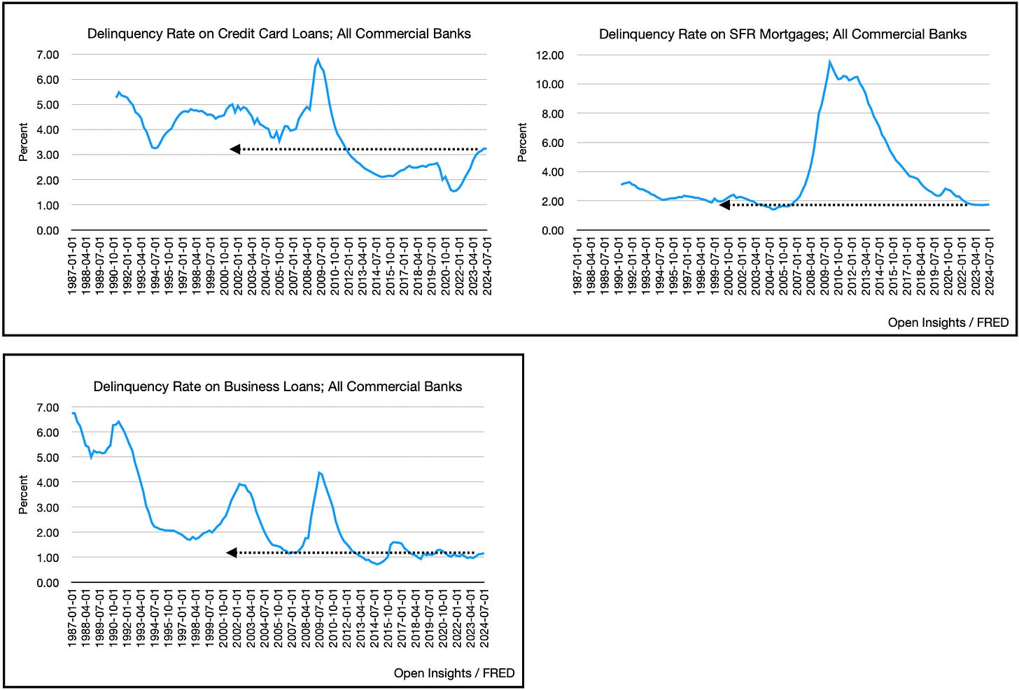 Just look at that top chart, total consumer credit is actually dipping vs. disposable personal income. As you’d further suspect, default rates also look like they’re peaking for credit card loans.