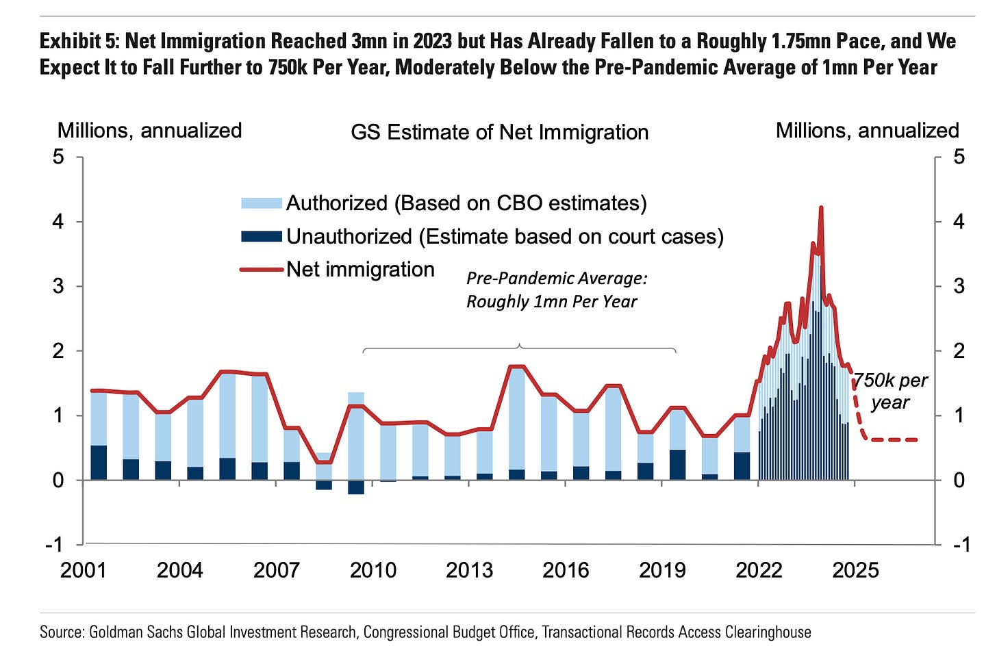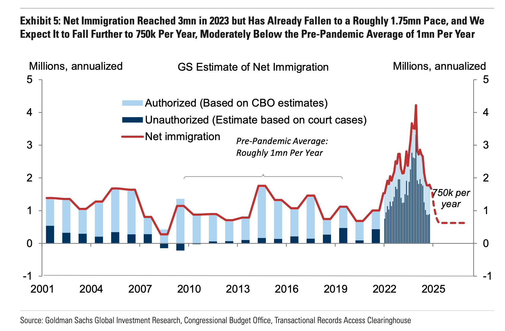 Immigration? It averages about 1.75M migrants a year these days. Pre-pandemic and during Trump 1.0, it averaged about 1M. So expect that to fall to the norm. Deportation for the criminals, but mass deportation? Unlikely given resource constraints (it’s costly and requires boots on the ground, which doesn’t square with the DOGE funding/government cuts being sought).