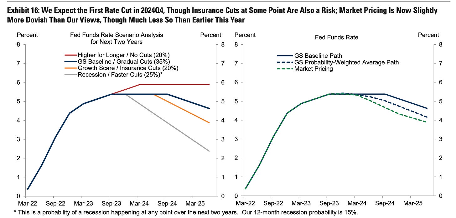 It strikes me that the likelihood of 125bps, as currently priced, of cuts is the least likely outcome. either GS is right, and there is a token 25bp-50bp cut late in the year as the economy maintains its growth trajectory, or we see 350bps-400bps as a recession comes to fruition. But, given the economy has withstood 5.50% rates pretty well so far, cutting for the sake of it seems the least likely outcome. at least to me