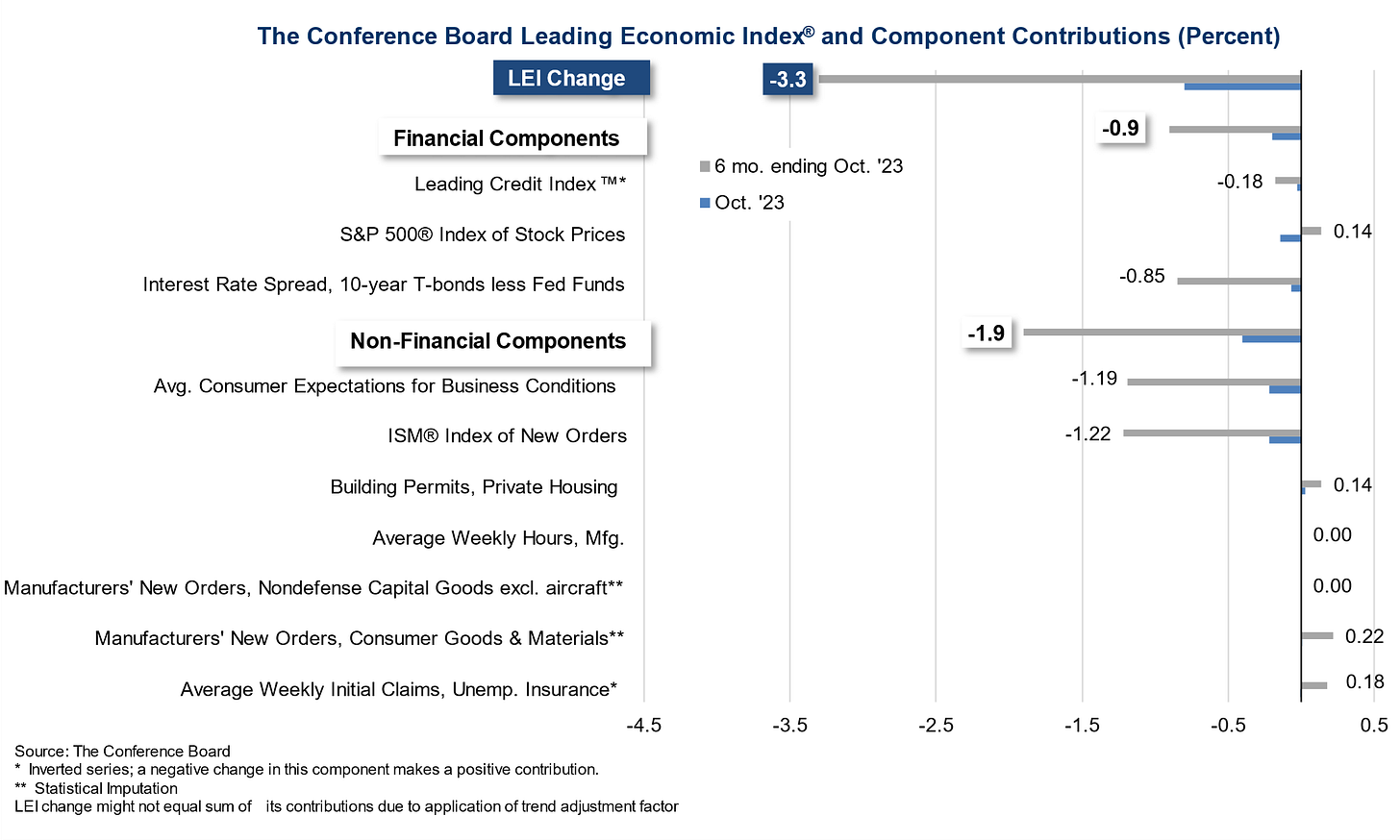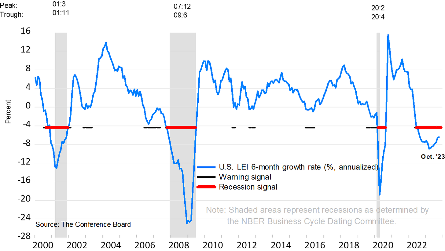 It kind of makes sense because the Fed’s constraining the cost of capital, starving the economy of liquidity. The Conference Board’s Leading Economic Index Indicator, a mish-mash of financial and non-financial components are already in recessionary ranges.