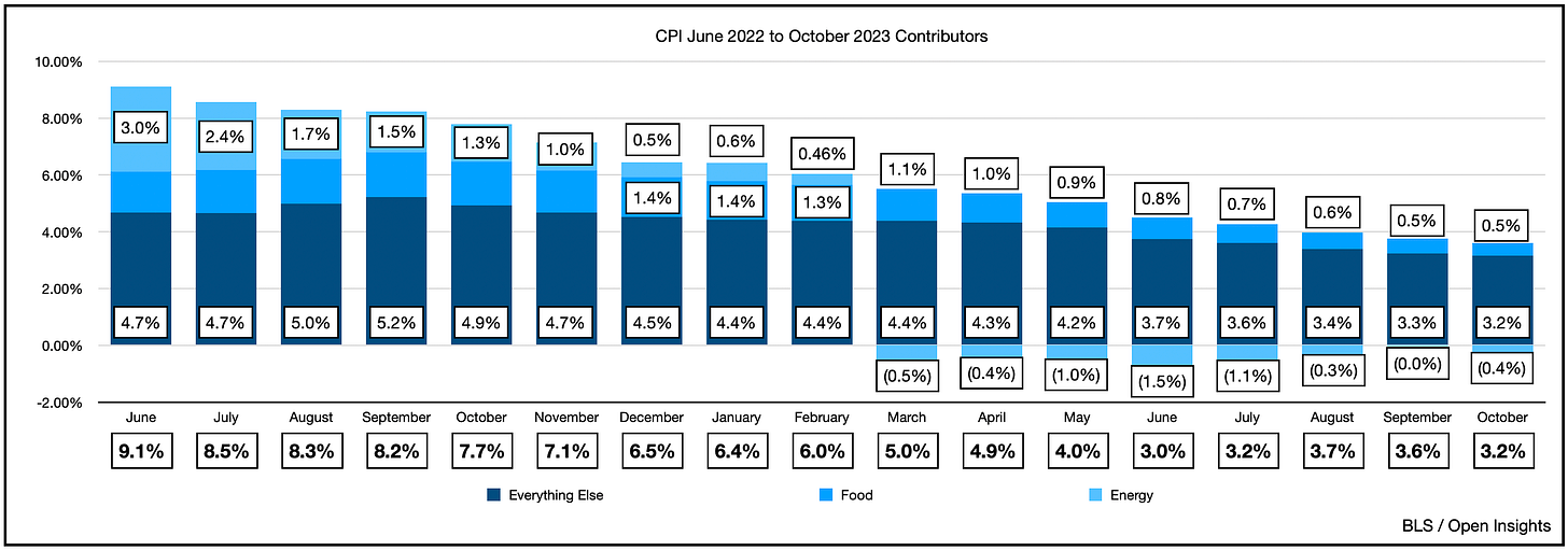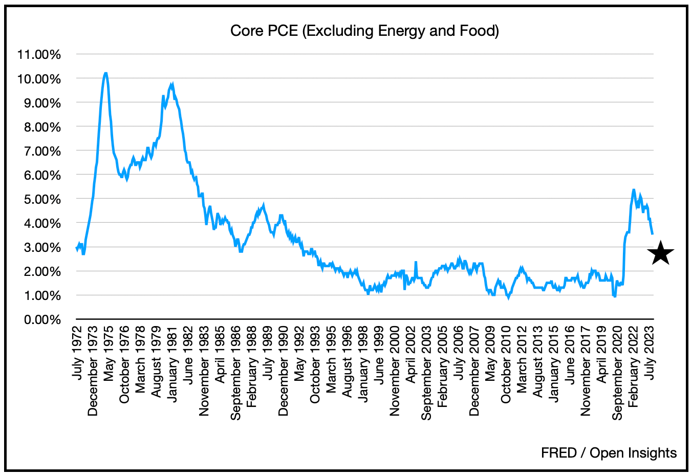 Inflation is falling, but hovering around 3-4%. It’s beginning to look like it’ll anchor near there, higher than the Fed’s 2% target. Here’s CPI . . .