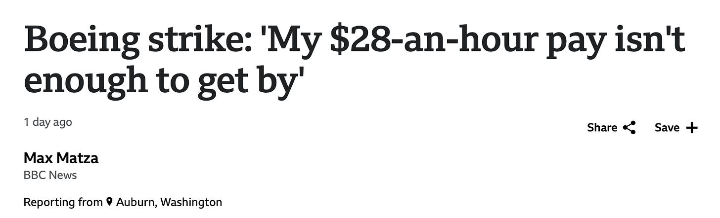 As Boeing union workers (30K of them), rejected a proposal to increase wages by 25% over 4 years, in an attempt to get 40% raises. Said another way, they’ll get at least 25% wage increases over 4 years . . . the question is how much more as the strike continues? Let’s say they land somewhere in the middle, 32%? Give or take 8% a year? Not too shabby . . .