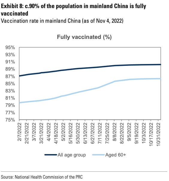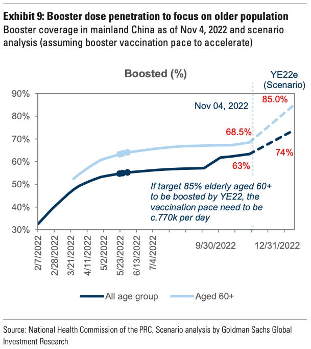 In Hong Kong, efforts to to increase vaccine/booster uptakes helped nudge the percentages up (e.g., reducing the duration of dosing for care-home residents, extending vaccination clinic operating house, deploying vaccine outreach teams to care homes, housing estates and residents with limited mobility). So we anticipate similar measures to be announced shortly. If booster penetration were the main focus, 85% of the elderly population over 60 years of age could be dosed within a few months. If booster rates stagnate? We can even imagine a scenario where China mandates vaccines for the elderly because remember . . . 98% efficacy.