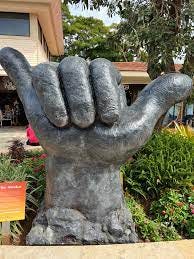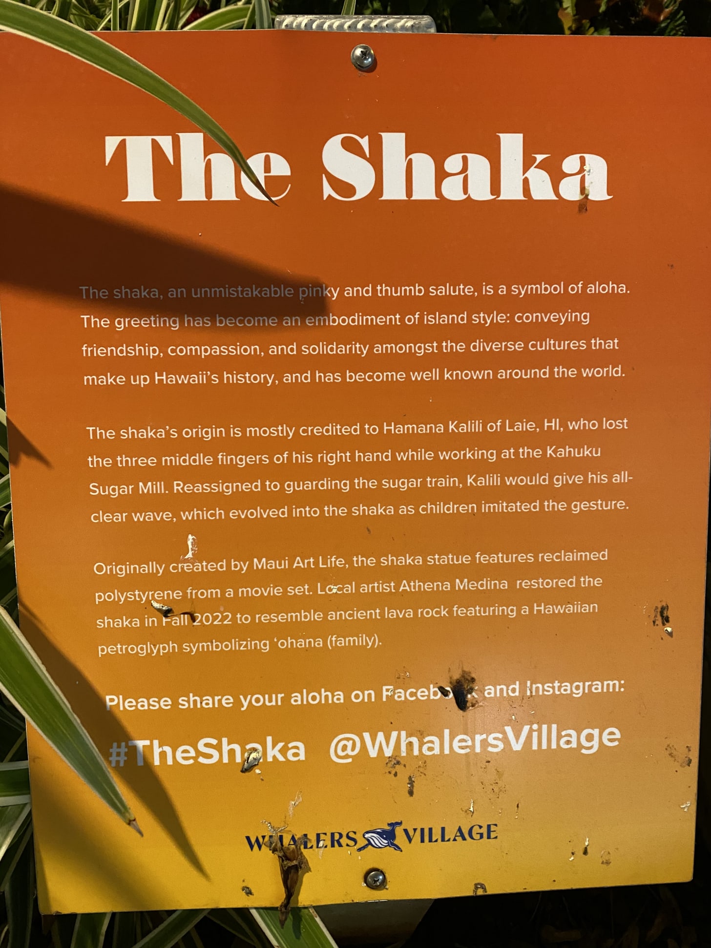 A giant shaka sculpture, which is a greeting of peace and love. My kids wanted a picture. So I took one . . . of the plaque.