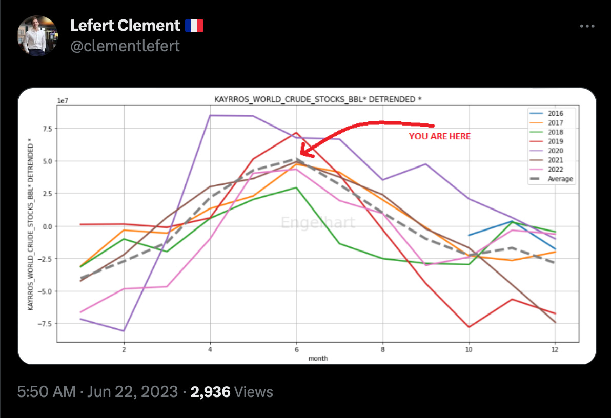 Heck we’re doing it in the markets as usual with claims that oil may never go up again. Forever in the $70s since inventories aren’t draining, maybe even $60s, or $50s if a recession comes. Well I guess, but there is that little thing called seasonality, and as my friend Clement notes . . . you are here.