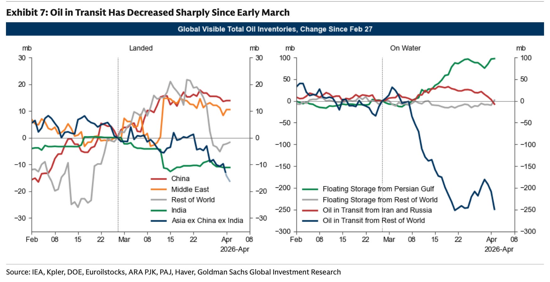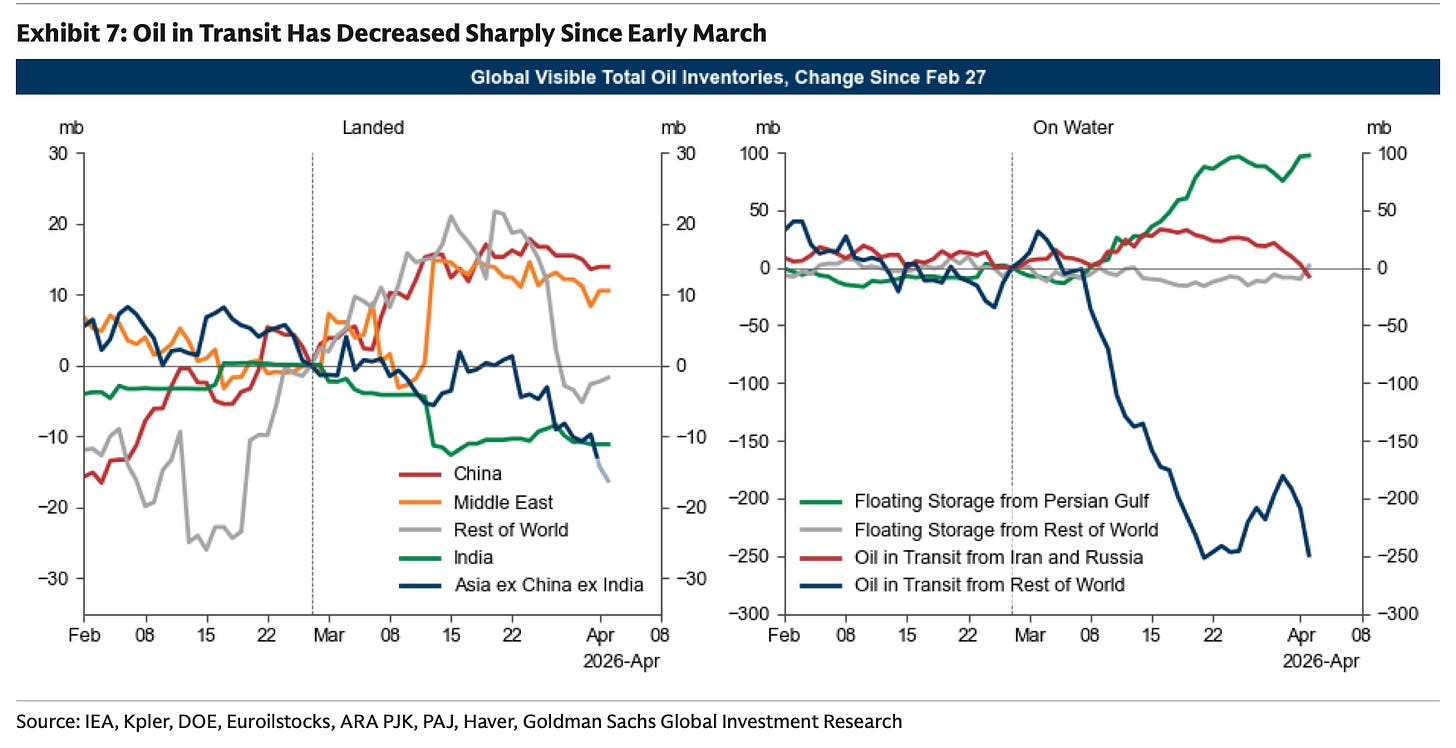 For the time being, inventories are draining from oil-on-water first as the physical air pocket increasingly impacts other regions besides Asia. As the last oil is delivered, watch inventories on land drop precipitously. We’d expect to see product stocks fall first, and then eventually crude. For some OECD countries like Japan, they’ve already stopped publishing data on product inventories, which tells you a lot about the direction of their reserves already. Europe is next.