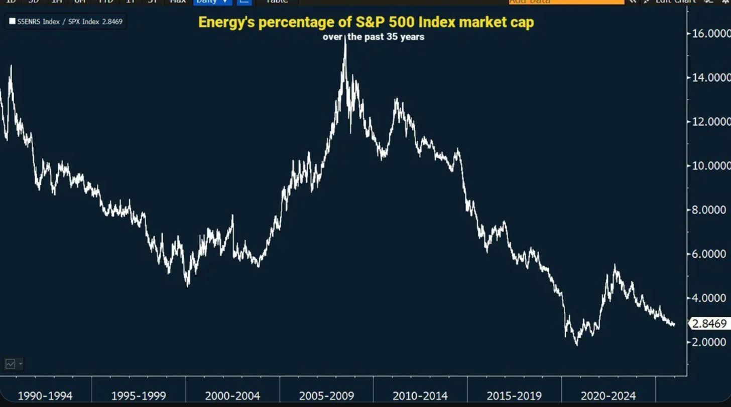It’s a reflection of what’s become of the market all these years. One where energy holdings cratered to about 3% of the overall value, more than halving from 2022, and multiples more from earlier before.