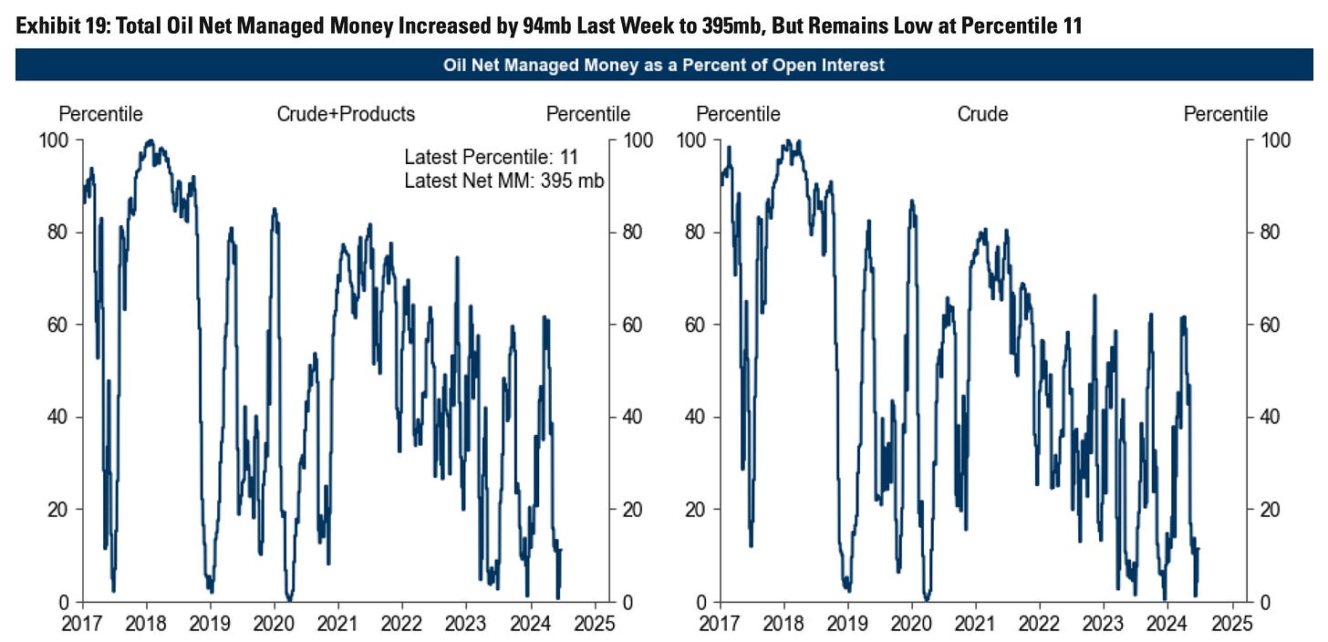 In fact, look at that lower right hand corner of the first chart. Total oil net managed money has already fallen to near zero. It’s since rebounded to the “11th percentile,” but there’s basically a rampaging bear in the paper markets rights now. So if we finally get some summer draws AND China’s economy finds its footing, and just stops bottoming, then we could set-up to spring back up to the $90s as financial players move back in.