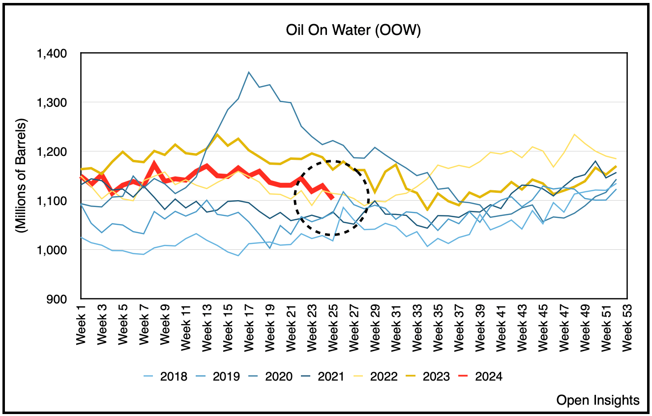 What’s heartening to see though is OPEC+ (namely the Saudis and Russia) beginning to pull back on exports. Consequently, oil on water (“OOW”) has begun to decline, slightly more than what seasonality would suggest.