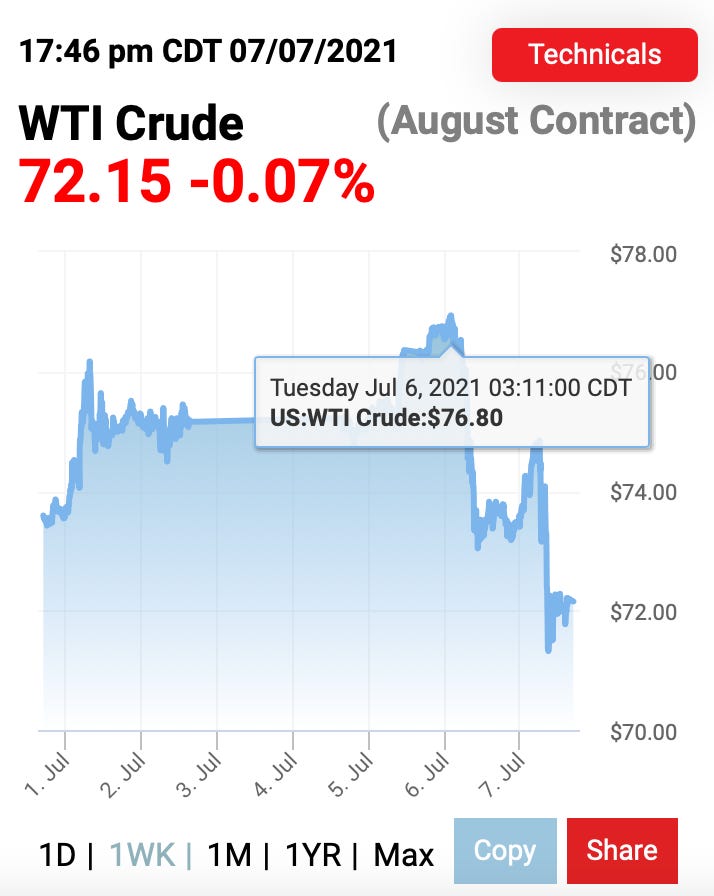 As background, OPEC+ held its monthly meeting last week, ostensibly to discuss raising production as global oil demand has steadily increased as vaccinations have accelerated throughout the world. As people venture out globally, large summer draws from inventory have begun occurring, and oil prices have climbed steadily higher and become increasingly backwardated. Prior to the meeting, WTI almost touched $77/barrel, though it has fallen back to $72/barrel in the days since.