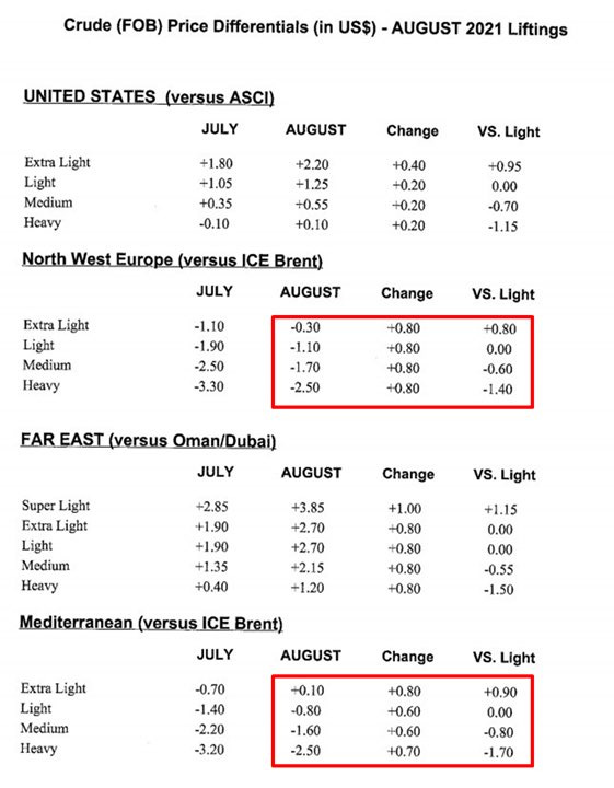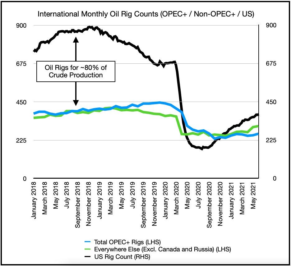 Still, to placate Russia and not overheat the oil market, OPEC+ agreed on a Saudi plan to increase output by 400K bpd per month from August to December, thereby raising production by 2M bpd by year end. The Saudis also proposed extending the OPEC+ agreement from March 31, 2022 to the end of 2022, which would allow the group to cautiously and fully unwind the entire “2020 cuts” of 5.7M bpd by the year-end 2022.