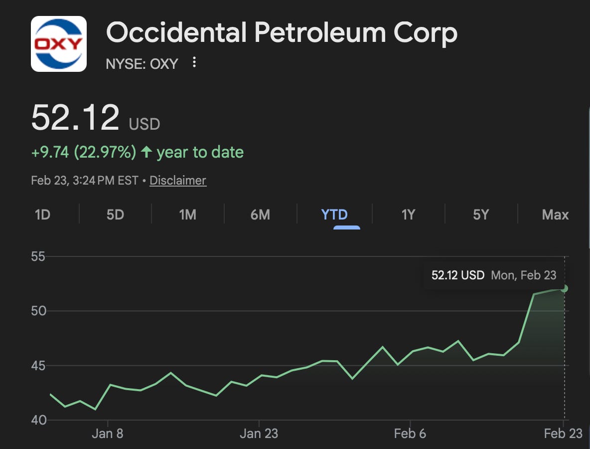 That’s the rough figure we use for Occidental Petroleum (“OXY”), a company we’ve been holding for a bit. This one’s been in the dog house for awhile after recently closing the CrownRock acquisition and selling its OXY Chem division to Berkshire Hathaway. The stock’s languished as oil prices trended lower in 2025. Having shed $10/barrel from $70 to high $50s, OXY similarly sympathized and fell by $10/share, give or take.