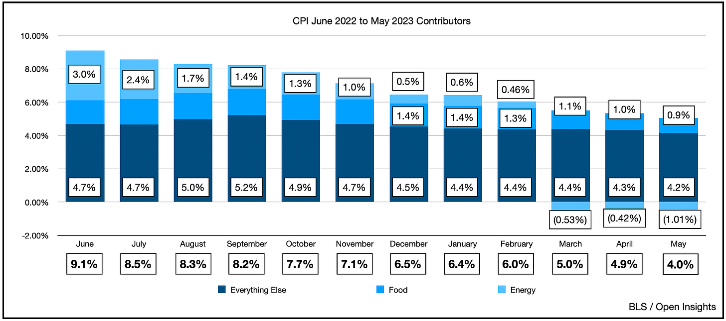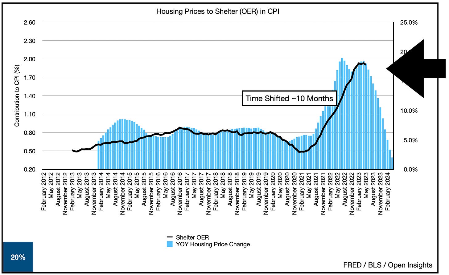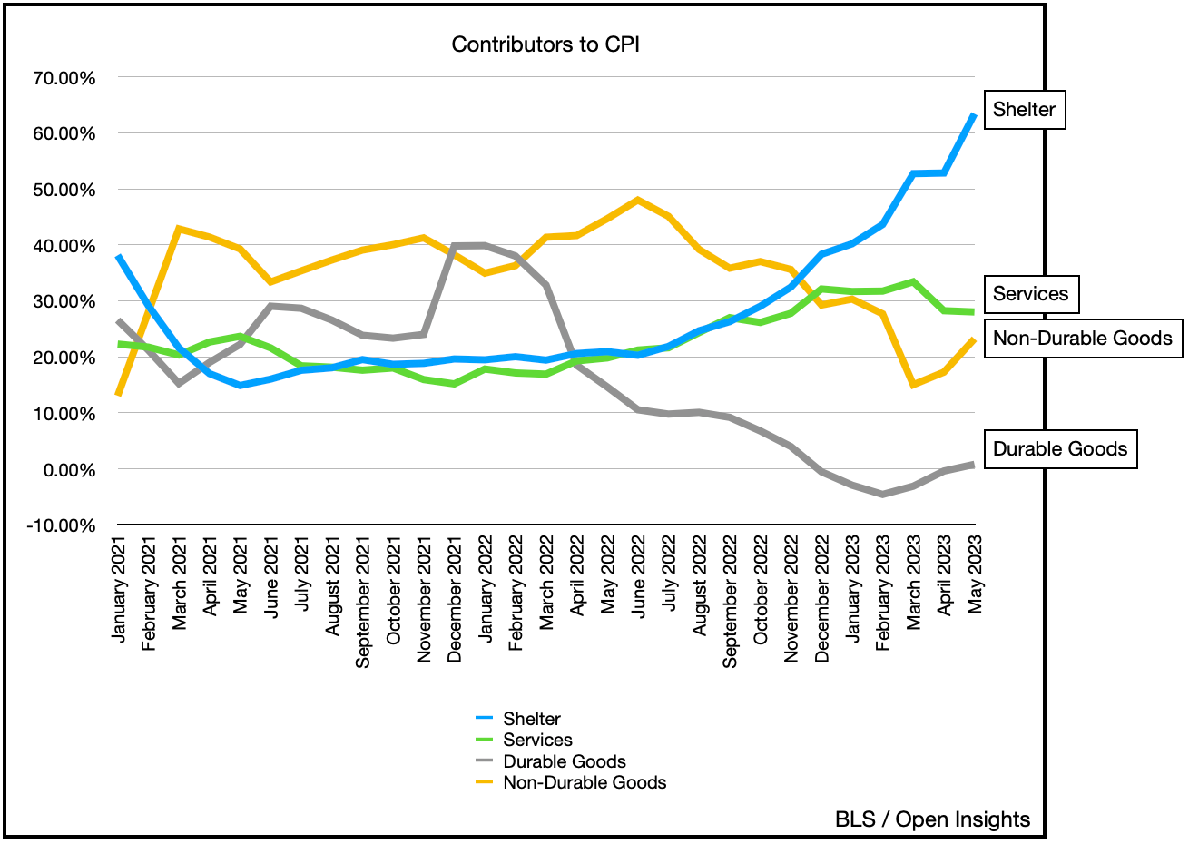 As you can see, the rising cost of shelter is disproportionately impacting inflation and contributing largely to the 4% headline inflation figure. Even though we believe it will simmer down eventually based on the latest housing data, eventually could mean a year.