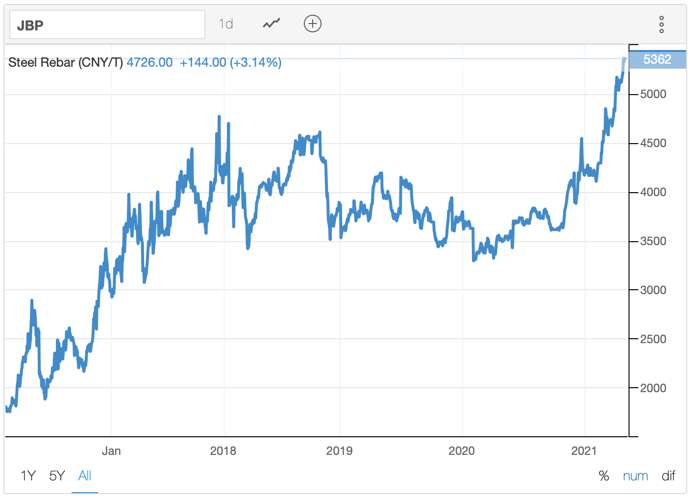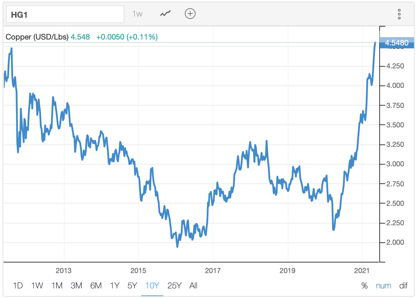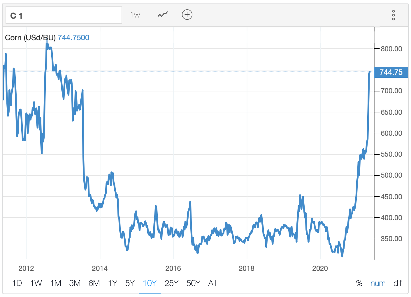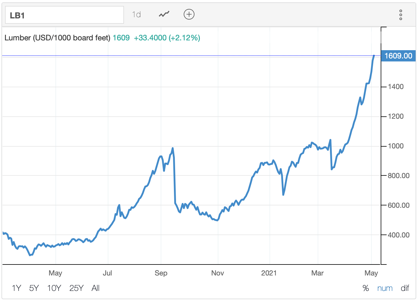 We’re 4 months into 2021 and a year out from when this COVID pandemic started. Now a central thesis that we’ve held for 2021 is that unprecedented fiscal and monetary spend will spur a dramatic bout of long-lasting and stubbornly high inflation. As the months have passed, we’ve seen the Wall Street Journal and the Financial Times pick up on this theme. Our forecast has been been proving true as commodity prices for all manner of commodities continue their rise. Let’s revisit some of the prices of the items we touched upon in our last snapshot two months ago.