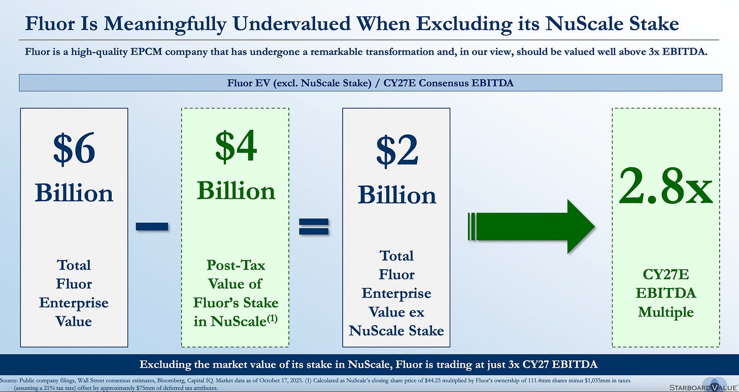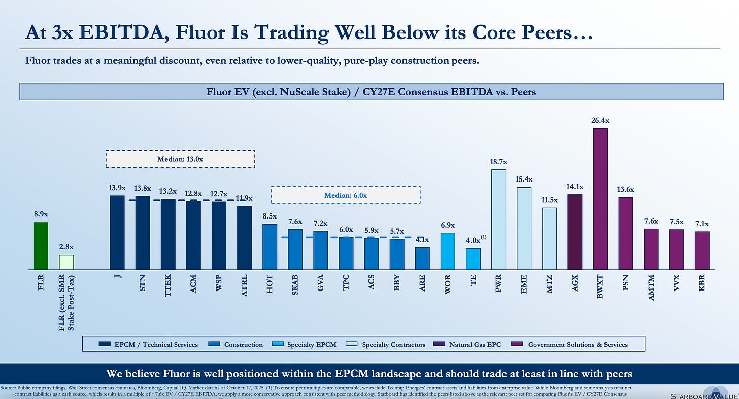 Now when Starboard ran its figures, NuScale’s stock was trading at $44/share and FLR stock was trading slightly lower, so instead of 2.8x CY27E EBITDA, we’re really at 5.6x CY27 estimates today.