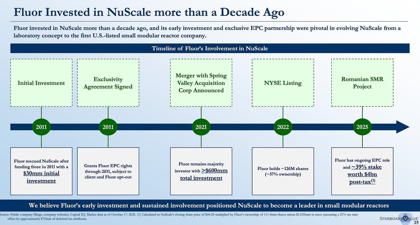 Here’s where it gets interesting. About 15 years ago, FLR actually bailed out a tiny company called NuScale as funding froze post-financial crisis. It was this pet rock of an investment, really an equity infusion into a company that maybe one day could develop its nuclear power plants, and then FLR would have first dibs at the engineering work. So in addition to providing a cash life line, FLR received not only equity, but an Exclusivity Agreement on any project NuScale would embark on would be serviced by FLR.
