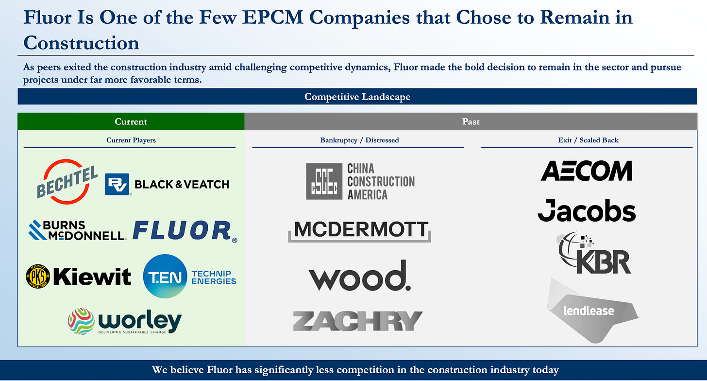Imagine building a refinery for $1B on a fixed price contract, hoping nothing goes wrong. Good luck with that. As you’d expect, many things go wrong and profitability inevitably plunges when you shoulder those costs because you inadvisedly bid “fixed price.” Risk is always two-sided in a contract. You either have it, or you don’t, and when you have it and it goes wrong, you eat it. EPC firms cratered and so did FLR’s stock. In comes the new CEO and today, the company’s on more solid footing, with less competition.