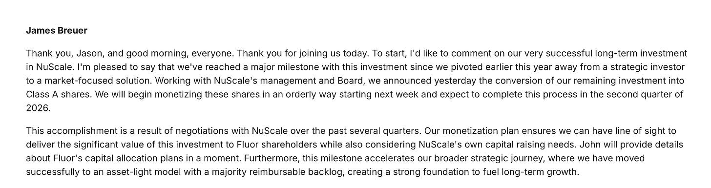 So it’s a foot race. It’s a foot race between how long this AI bubble can go on before FLR can sell down its holdings and repurchase its stock. FLR’s agreement with NuScale is an orderly divestiture from November until the end of Q2 2026, so give or take 7 more months with November already in the books and soon December, and each month of divesting 15M NuScale shares.