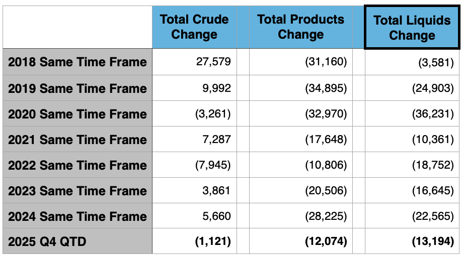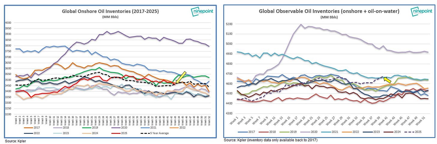 What about inventories in the OECD countries where oil is priced you ask? Well our proxy real-time tracker doesn’t show significant builds yet, but it is October, so let’s wait until we see November and December. So far, so good though, and 2025 Q4 QTD for OECD territories? Kinda like every other year.