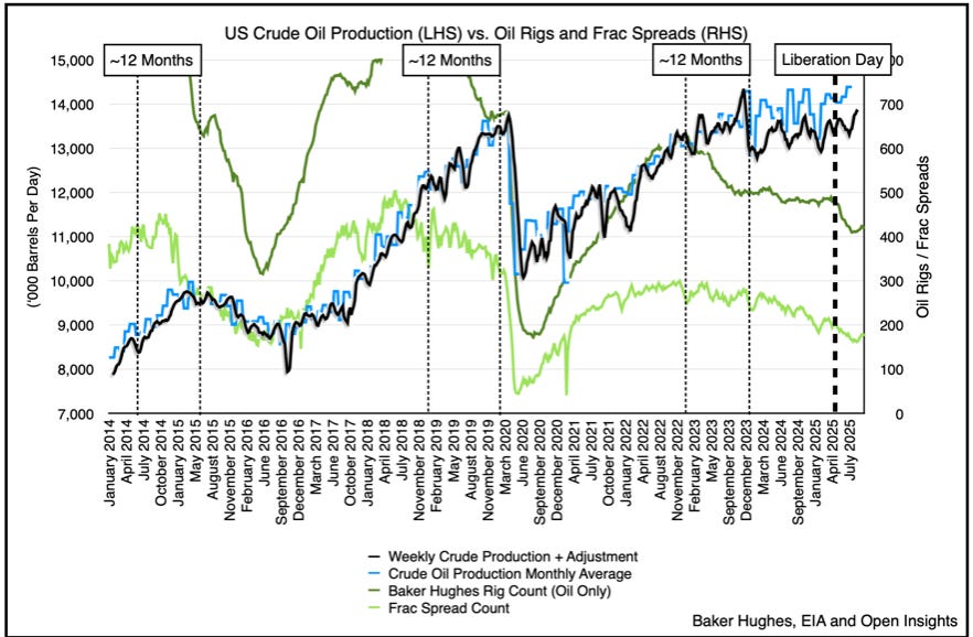 Although rig counts declined post-Liberation Day, the Israel/Iran ruckus in Q3 (and the short-term oil spike) allowed producers to hedge and we’re seeing that trickle through to capex budgets. Greater efficiency in drilling have also helped firms to maintain their production profiles, even with rig counts and frac spreads falling. As the kids say though . . . don’t get it twisted, yo.
