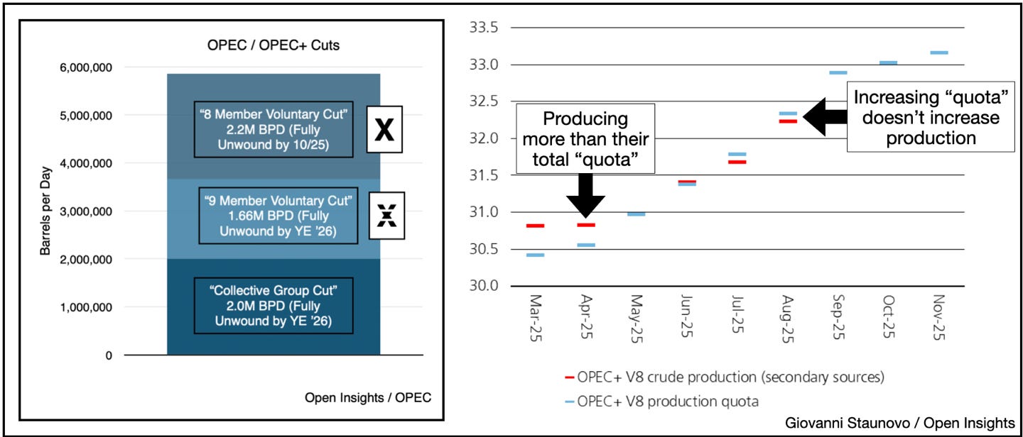 Okay we were wrong about this quarter and what’s been transpiring. As we left off Q2, inventories were building in H1 2025, as higher US production coupled with OPEC+ tapering their prior production cuts means supplies were coming. We had anticipated that OPEC+ would bring on supplies at a fraction of the cuts they’ve unwound, keeping prices in check, but what they brought back was much higher than anticipated and closer to the unwound quotas.